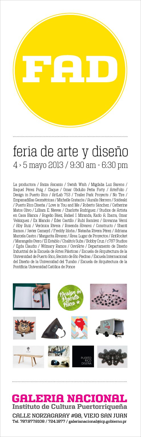 Por segunda vez, la Galería Nacional convoca a 50 de artistas para la Feria de Arte y Diseño que se llevará a cabo el sábado, 4 y domingo, 5 de mayo de 2013, de 9:30 de la mañana a las 5:30 de la tarde, en la Galería Nacional en el Viejo San Juan.