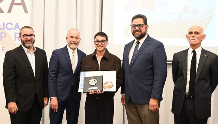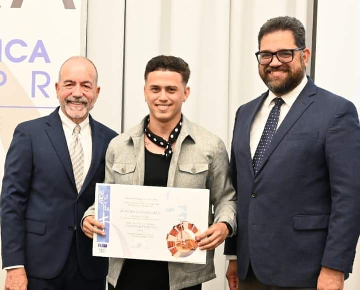 Sebastián R. Medina Colón quién su proyecto de Fin de Carrera fue una de las menciones de honor de la edición de la Medalla FLPD 2024 posando con nuestro decano y presidente.
