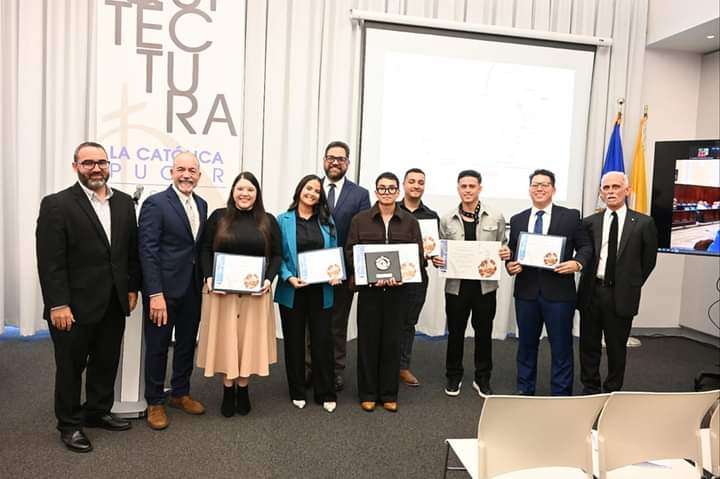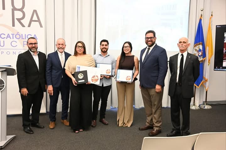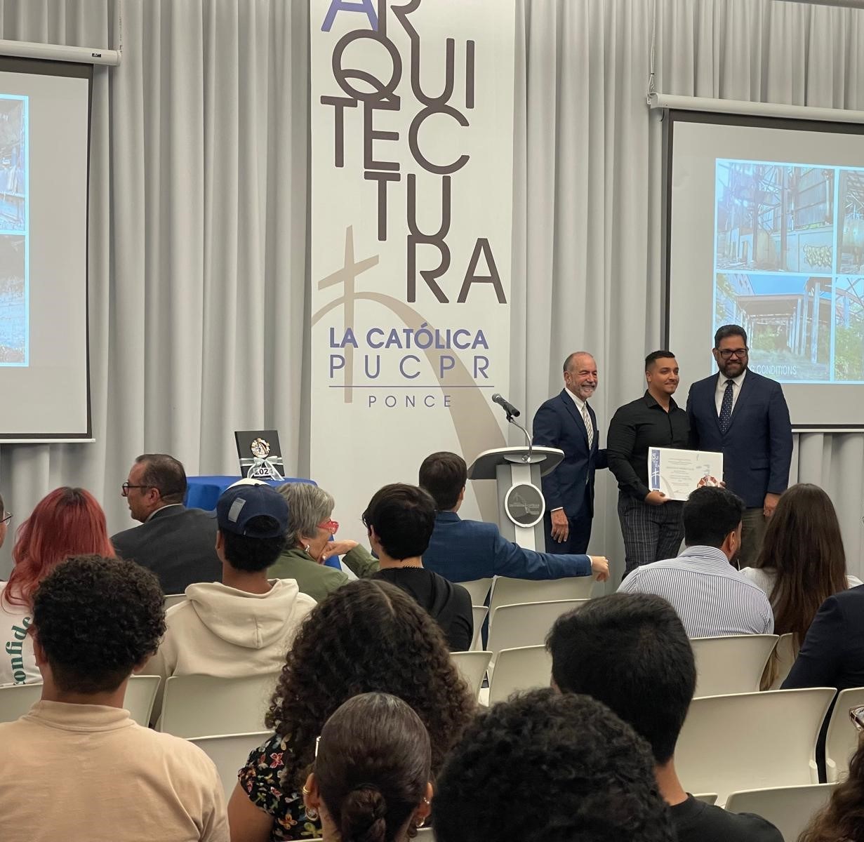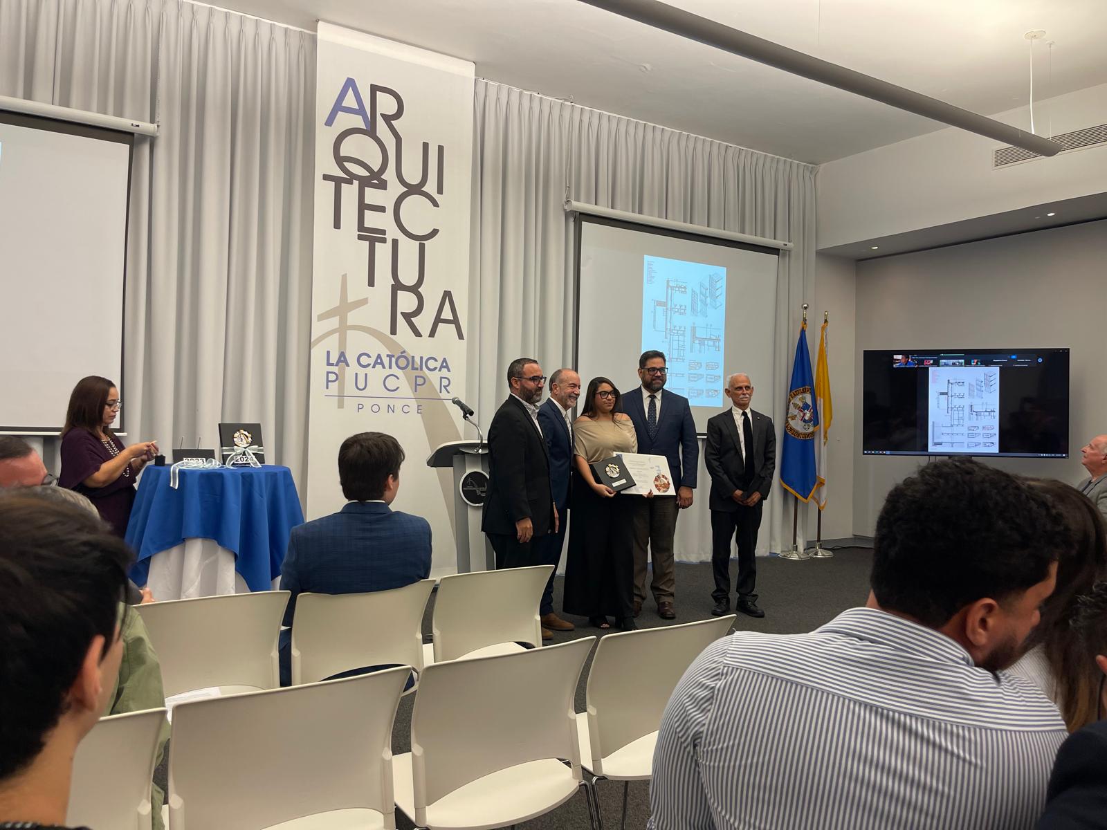 Los egresados nominados de la clase 2023 para ganar la Medalla A la Excelencia en el Diseño FLPD 2023 en conjunto con el Prof. Pedro Rosario, el Arq. Luis V. Badillo,decano de nuestra Escuela, el Lcdo. José A. Frontera Agenjo, presidente de la PUCPR y el Arq. José Coleman Davis, uno de los miembros del jurado.