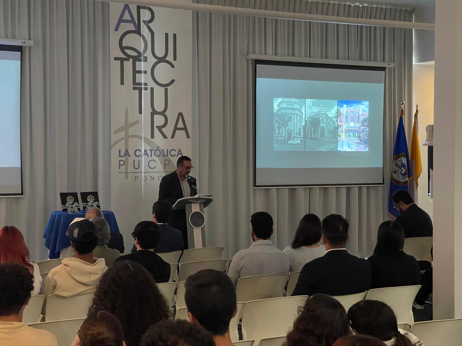 El Arq. José Coleman Davis brindando sun conferencia previo a la Ceremonia de Premiación de la Medalla a la Excelencia en el Diseño Francisco Luis Porrata Doria 2023 y 2024.