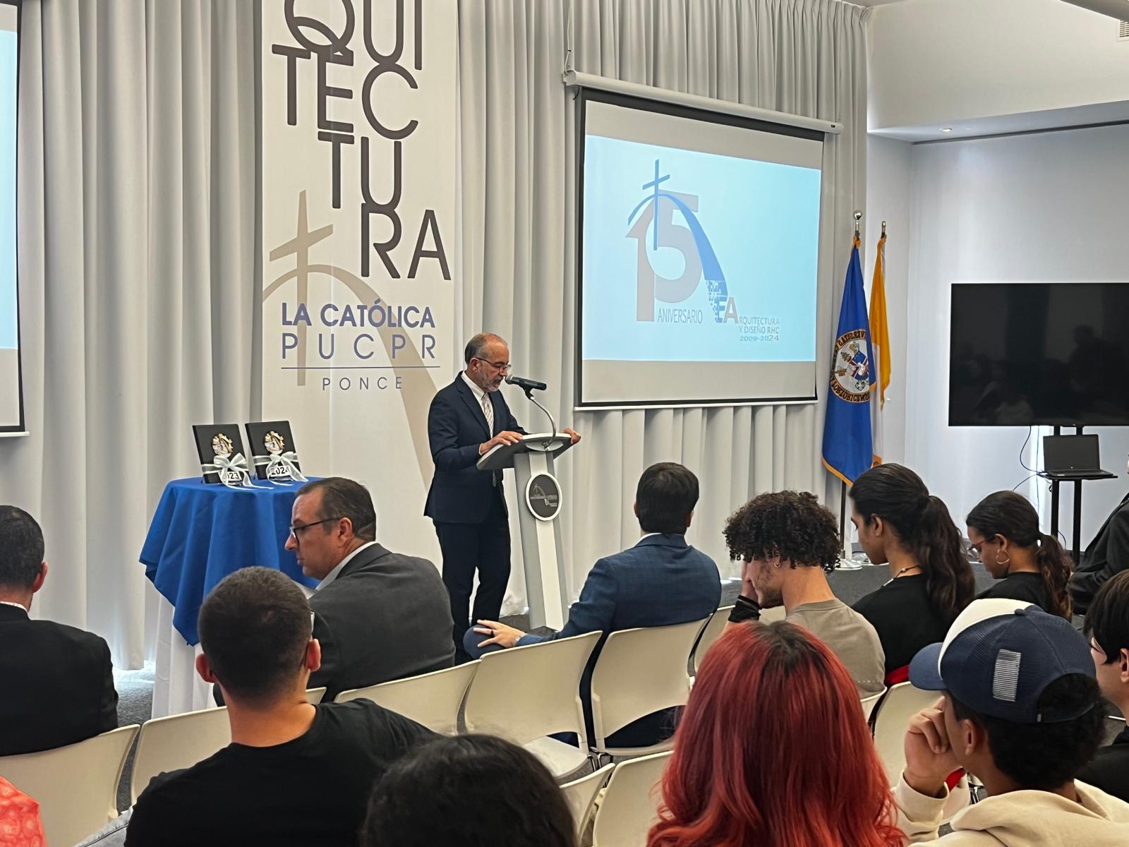 El decano Luis V. Badillo ofreciendo un mensaje de bienvenida en la Ceremonia de Premiación de la Medalla a la Excelencia en el Diseño Francisco Luis Porrata Doria 2023 y 2024.