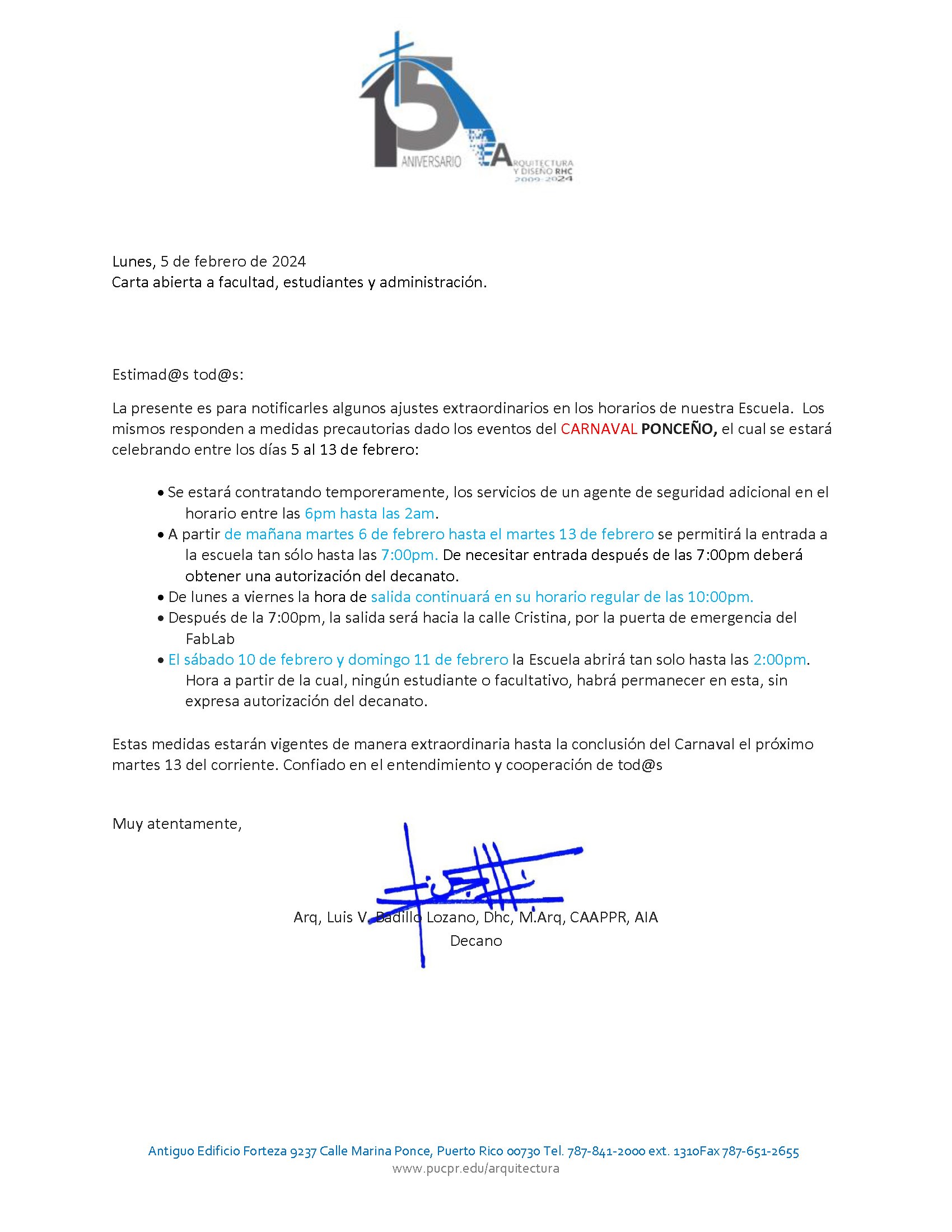 Durante el día de hoy, nuestro Decano, el Arq. Luis V. Badillo Lozano emitió la siguiente carta abierta a la comunidad universitaria de nuestra Escuela comunicando ajustes en el horario como parte de medidas de precautorias ante las festividades del Carnaval ponceño en Plaza Las Delicias del 5 al 13 de febrero.