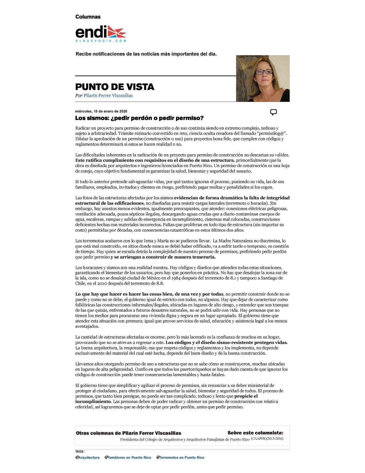 Ante la reciente actividad sísmica, nos cuestionamos el proceso de permisos de construcción y las edificaciones clandestinas. La Prof. Pilarín Ferrer Viscasillas ofrece su peritaje en este tema en el articulo de la sección Punto de Vista del periódico El Nuevo Día el pasado miércoles, 15 de enero de 2020.