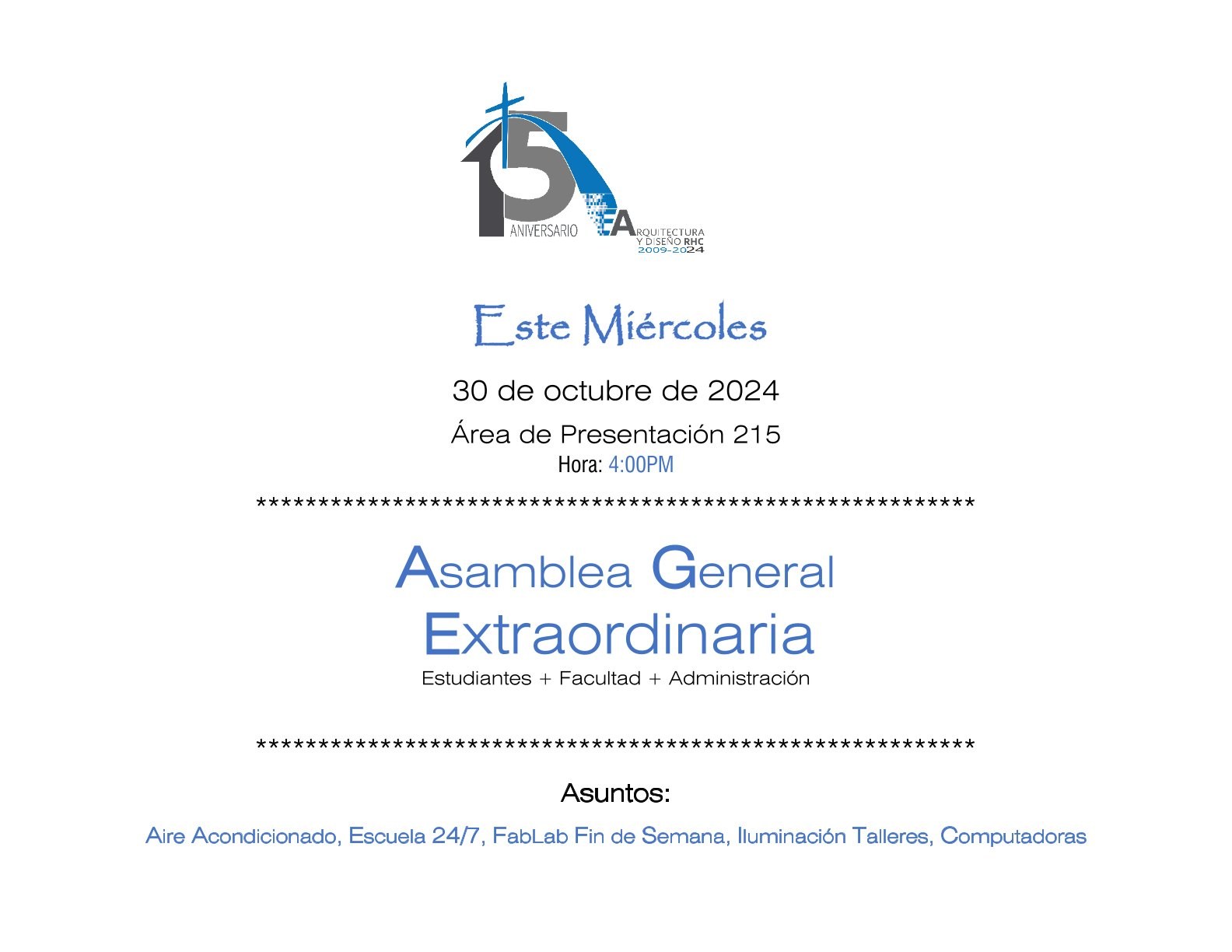 Convocamos a nuestra comunidad universitaria a una Asamblea General Extraordinaria este próximo miércoles a las 4PM en el Área de Presentación #215 a tratar unos asuntos esenciales para nuestra Escuela.