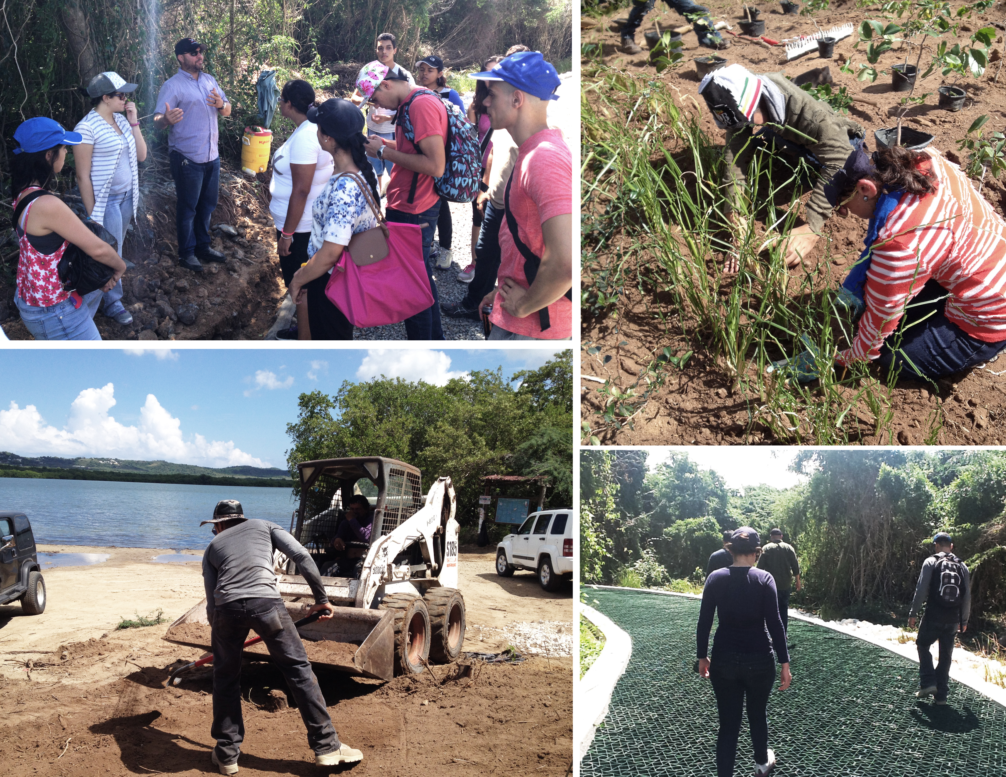 Los estudiantes Ashley Burgos, Jean Carlos Rodríguez, Elimelec Rodríguez, Juan Torres y Edgardo López pudieron participar de la presentación a los concesionarios del diseño propuesto parcialmente completado, y lograron obtener insumo a ser incorporado en las fases subsiguientes del proyecto. Además, pudieron participar de la construcción de jardines pluviales, de la instalación de trincheras de Vetiver y de de canales de rocas para el control de sedimentación, además de participar en siembra del material vegetativo, parte de la propuesta de mitigación y reforestación del área. Como fase subsiguiente los estudiantes estarán diseñando un paseo tablado que guie de forma segura y recreada a los visitantes tanto nocturnos como diurnos. En adición, junto a los oclaboradores del proyecto, diseñarán, fabricarán e instalarán un sistema de rotulación educativa y de orientación para los visitantes de la Bahía Mosquito.