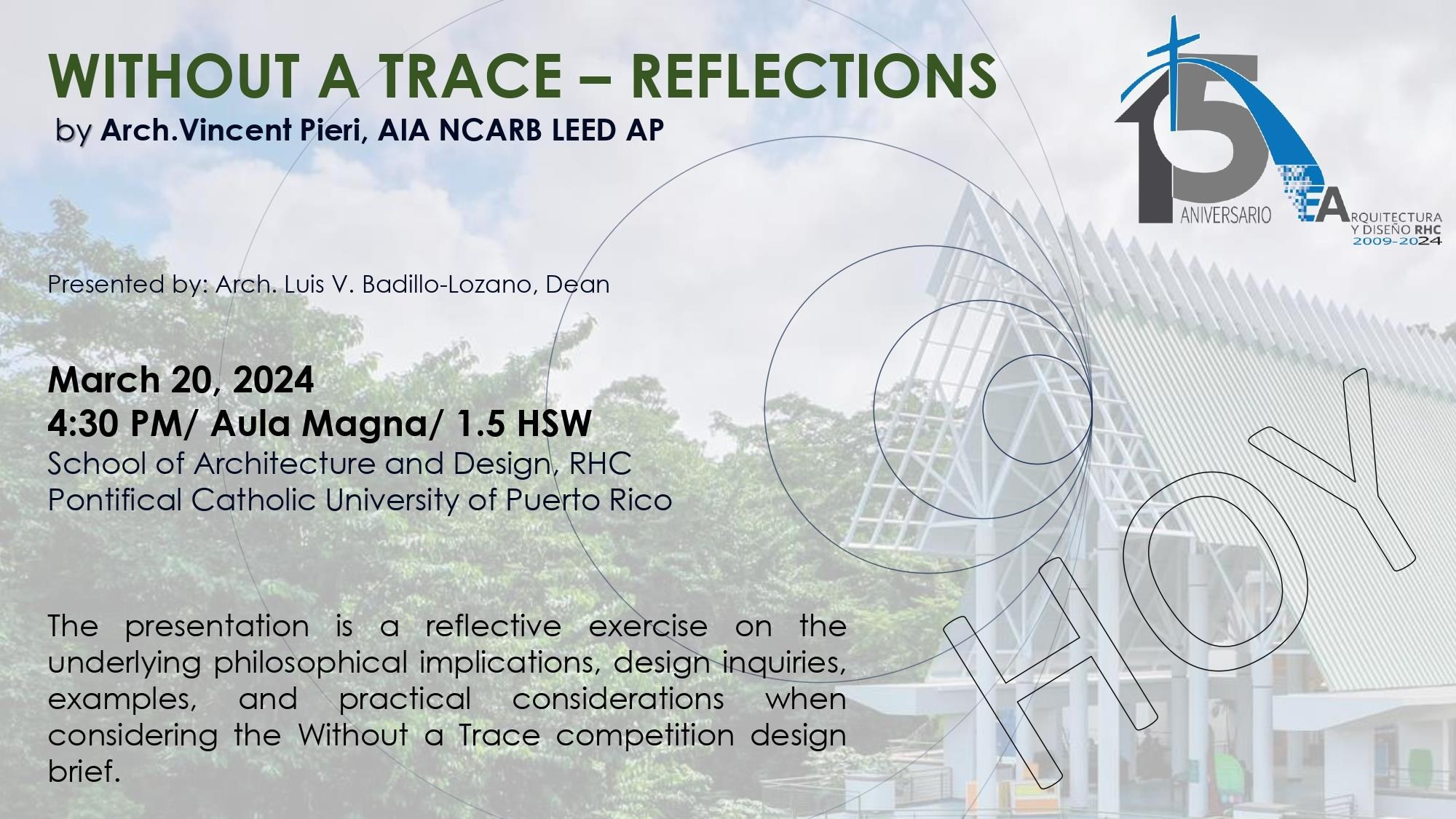 Hoy a las 4:30PM en el Aula Magna de nuestra Escuela, el Arq. Vincent Pieri nos ofrecerá la conferencia “Without A Trace Reflections” en donde se hablarán sobre las implicaciones filósoficas y consideraciones prácticas de la competencia de Without A Trace.