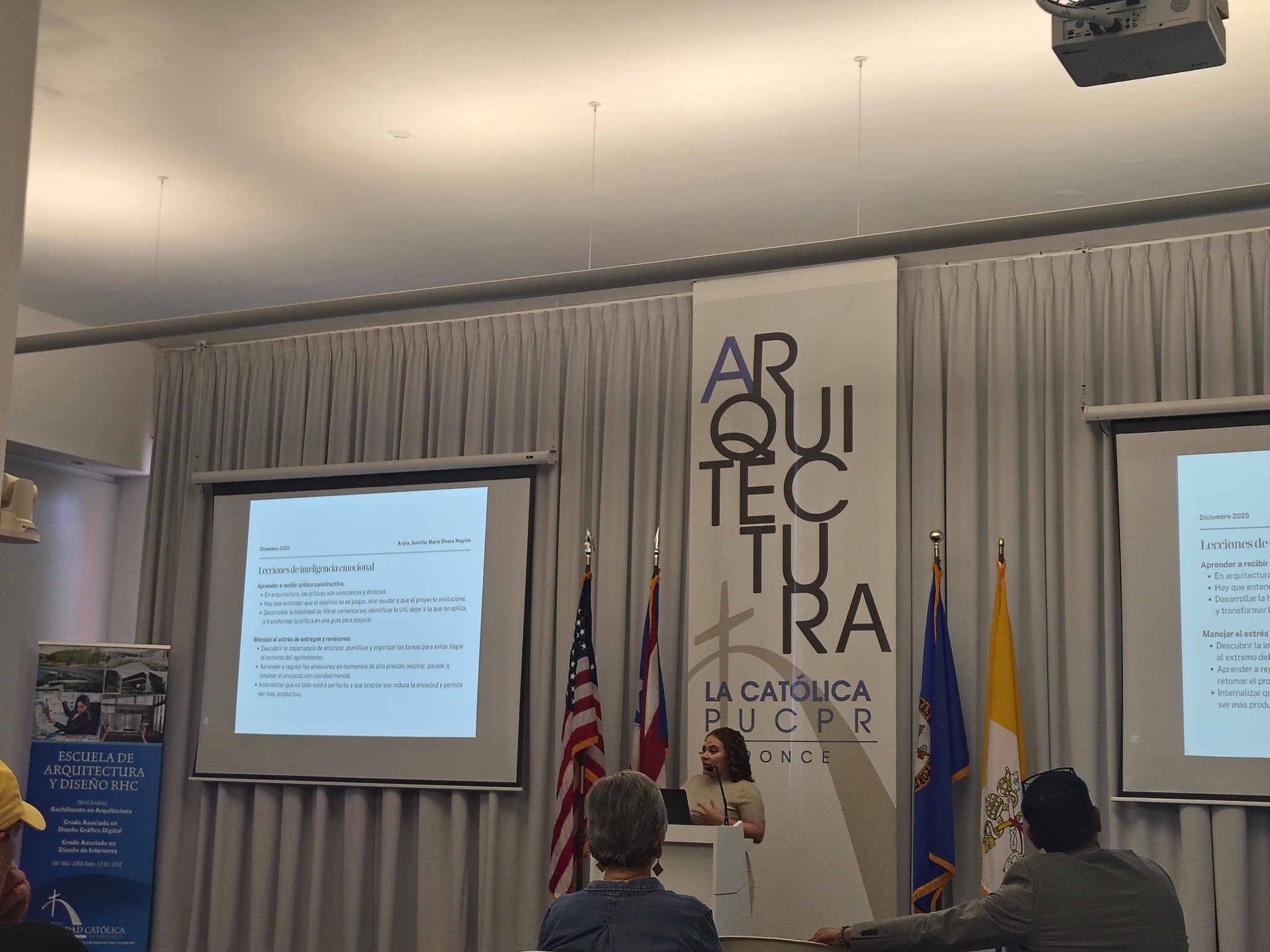 Arq. Ent. Jennifer Rivera Negrón (Egresada de la Escuela): Compartió su visión de primera mano sobre cómo la inteligencia emocional fue determinante para triunfar en su camino profesional tras graduarse.
