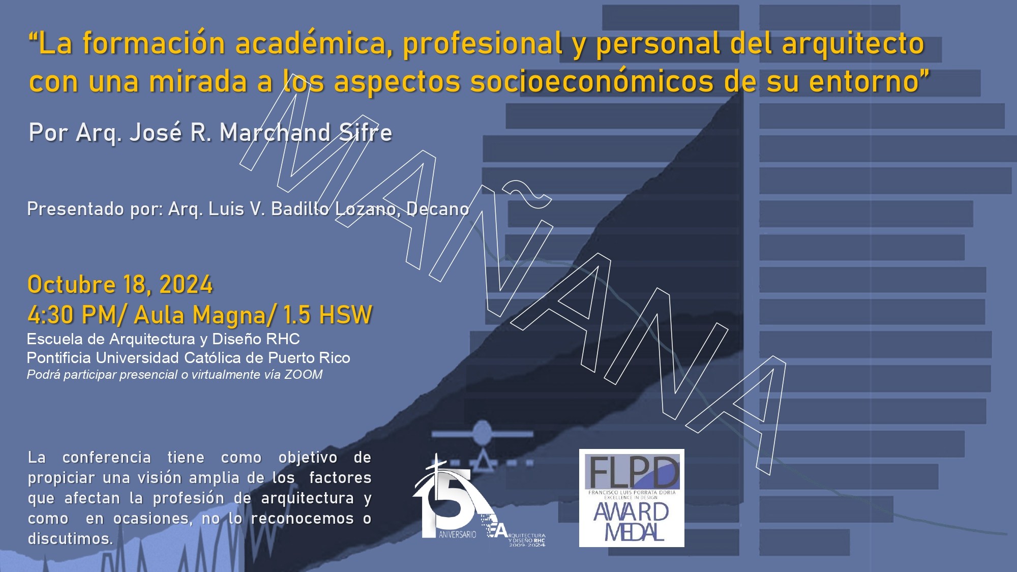 MAÑANA tendremos la conferencia “La formación académica, profesional y personal del arquitecto con una mirada a los aspectos socioeconómicos de su entorno” ofrecida por el arquitecto José R. Marchand Sifre. El Arq. José Ricardo Marchand Sifre será uno de los miembros del jurado para nuestra Medalla a la Excelencia en el Diseño Francisco Luis Porrata Doria 2023 y 2024. La conferencia se ofrecerá virtual y presencialmente desde el Aula Magna de nuestra Escuela.