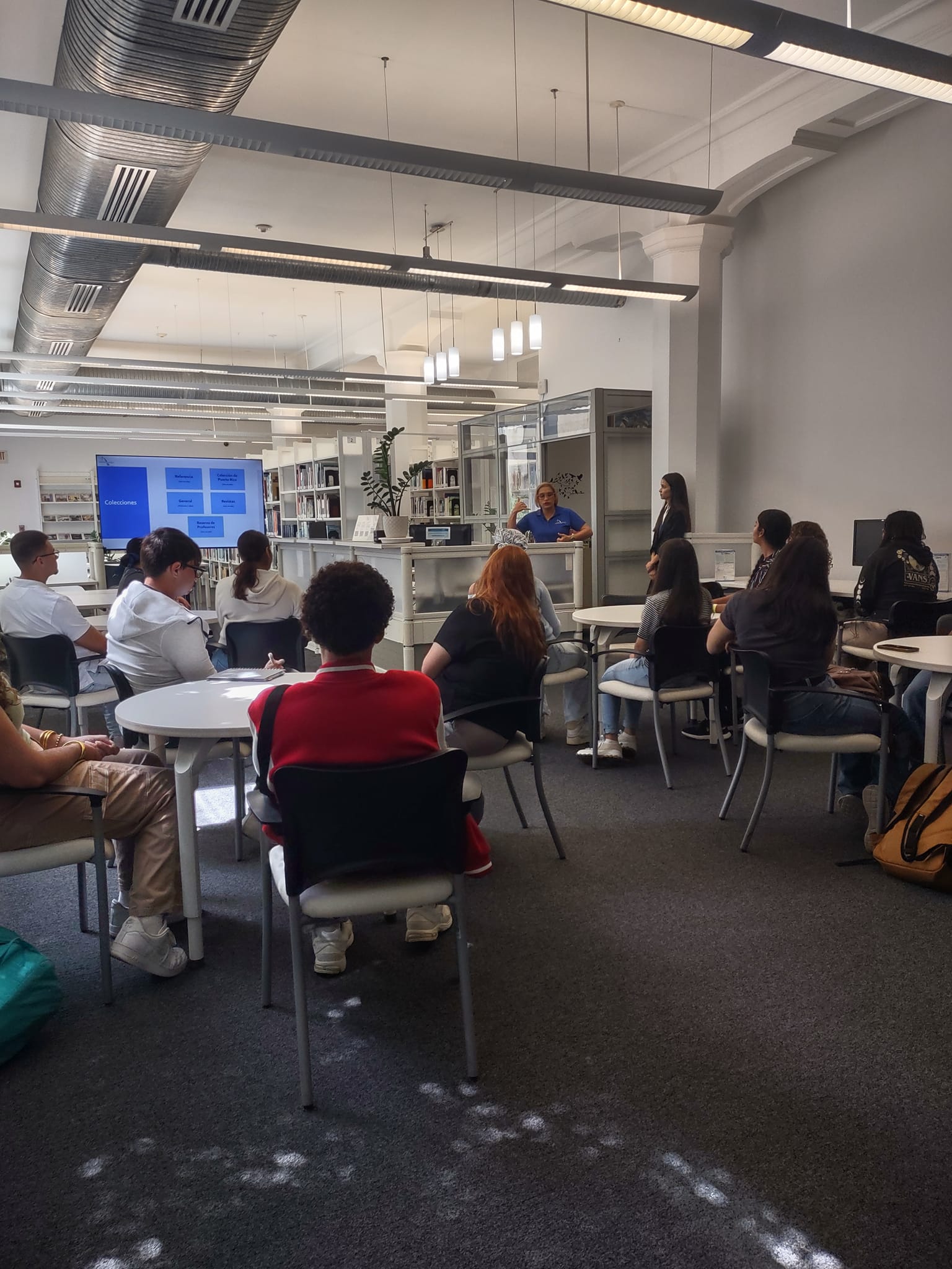 Los estudiantes asistentes tuvieron la oportunidad de conocer las distintas áreas y oficinas de servicios de nuestra Escuela. Aquí en esta imagen están siendo orientados sobre como utilizar los recursos que tienen disponible en la Biblioteca CARIBET de nuestra Escuela