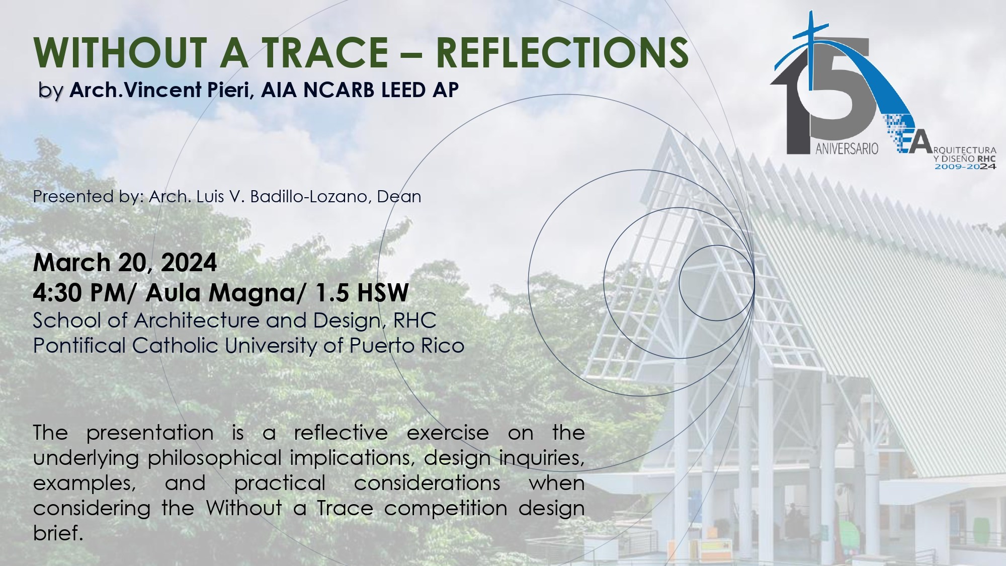 Este próximo miércoles 20 de marzo se llevará a cabo la conferencia “Without A Trace Reflections” ofrecida por Arq. Vincent Pieri a las 4:30PM en el Aula Magna de nuestra Escuela. El Arq. Vincent Pieri es un miembro del jurado de la competencia de diseño sostenible “Without A Trace” lanzada el pasado 23 de febrero. La conferencia será ofrecida de forma híbrida para que los que no pueden asistir de forma presencial a nuestra Escuela, puedan conectarse vía enlace por Zoom.